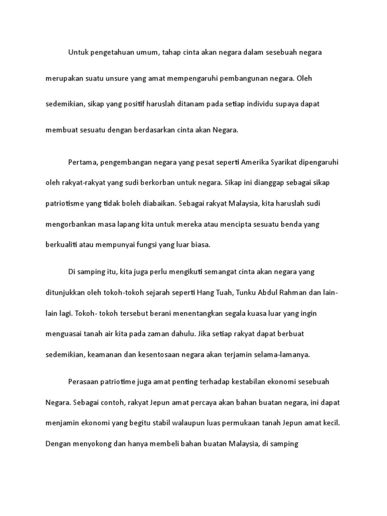 Secara holistiknya masyarakat yang mempunyai semangat yang tinggi untuk memperjuangkan tanah airnya akan sentiasa berusaha untuk meningkatkan kemajuan negara supaya duduk sama rendah tegak sama tinggi dengan negara-negara maju yang lain. Remaja yang tidak mempunyai semangat patriotisme lebih mudah untuk berhijrah ke negara asing jika negara kita mengalami kesusahan seperti masalah ekonomi bencana alam dan sebagainya. 353466440 Karangan Cinta Akan Negara Docx Untuk Pengetahuan Umum Tahap Cinta Akan Negara Dalam Sesebuah Negara Merupakan Suatu Unsure Yang Amat Course Hero For more information and source see on this link.