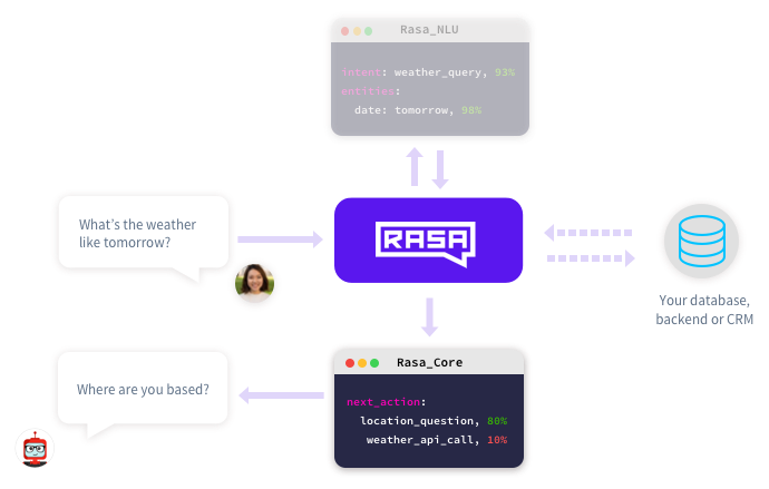 Rasa provides a framework for developing AI chatbots that uses natural language understanding NLU. This is called dialogue management and is handled by your Core model. Rasa train Talk to your Assistant.